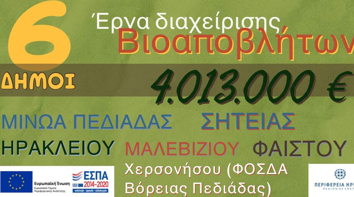 Ανάπτυξη συστήματος χωριστής συλλογής βιοαποβλήτων στο Δήμο Μινώα Πεδιάδας. Προϋπολογισμός 599.242,09 ευρώ.