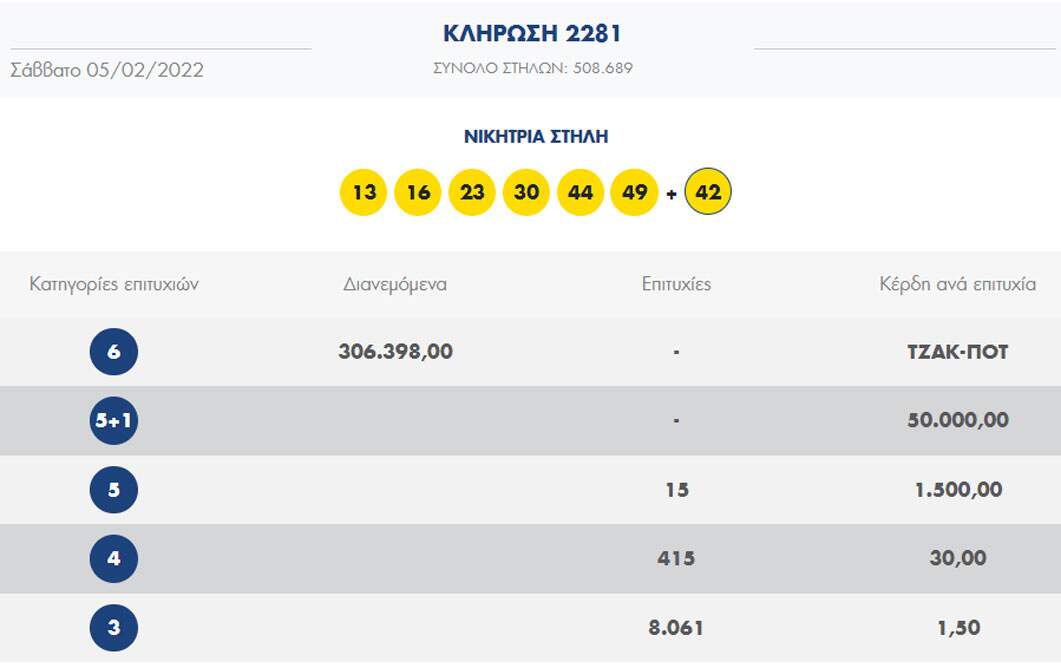 Οι τυχεροί αριθμοί στο ΛΟΤΤΟ 5 Φεβρουαρίου 20225 Φεβρουαρίου 2022 Δείτε τους αριθμούς που αναδείχτηκαν στη σημερινή κλήρωση (5/2/2022) στο Λόττο