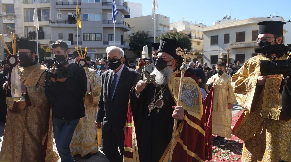 Σας καλωσορίζω στην γενέτειρά σας, το Ηράκλειο, συνοδεία σεβαστών Ιεραρχών και με την εξόχως τιμητική παρουσία του Προέδρου της Κυβερνήσεως, του πρόεδρου του ΚΙΝΑΛ, εκπροσώπου του ΣΥΡΙΖΑ, μελών του Υπουργικού Συμβουλίου, βουλευτών της Κρήτης, εκπροσώπων της Τοπικής Αυτοδιοίκησης, καθώς και του πολιτικού και πνευματικού κόσμου της χώρας. Τους ευχαριστούμε που βρίσκονται κοντά μας αυτή, την ιστορική για την πόλη και το νησί μας, ημέρα.