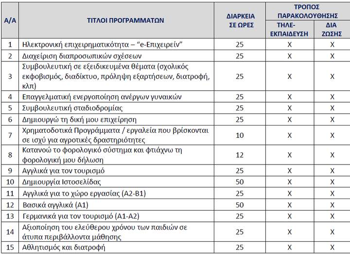 | Α/Α | ΤΙΤΛΟΙ ΠΡΟΓΡΑΜΜΑΤΩΝ | ΔΙΑΡΚΕΙΑ ΣΕ ΩΡΕΣ | ΤΡΟΠΟΣ ΠΑΡΑΚΟΛΟΥΘΗΣΗΣ | |