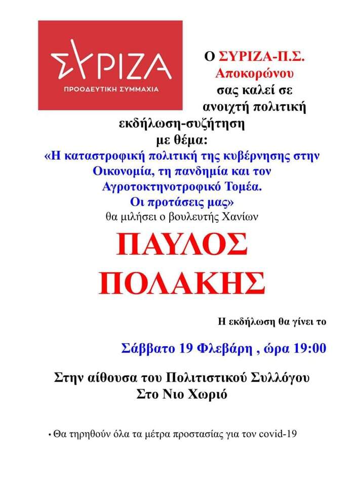 Ανοιχτή πολιτική συζήτηση-εκδήλωση, με τίτλο «Η καταστροφική πολιτική της κυβέρνησης στην οικονομία, την πανδημία και τον αγροτοκτηνοτροφικό τομέα. Οι Προτάσεις μας» διοργανώνει ο ΣΥΡΙΖΑ Προοδευτική Συμμαχία Αποκορώνου, με ομιλία του βουλευτή Χανίων Παύλου Πολάκη, το Σάββατο 19/2 και ώρα 7μμ στο Νιο Χωριό Αποκορώνου.