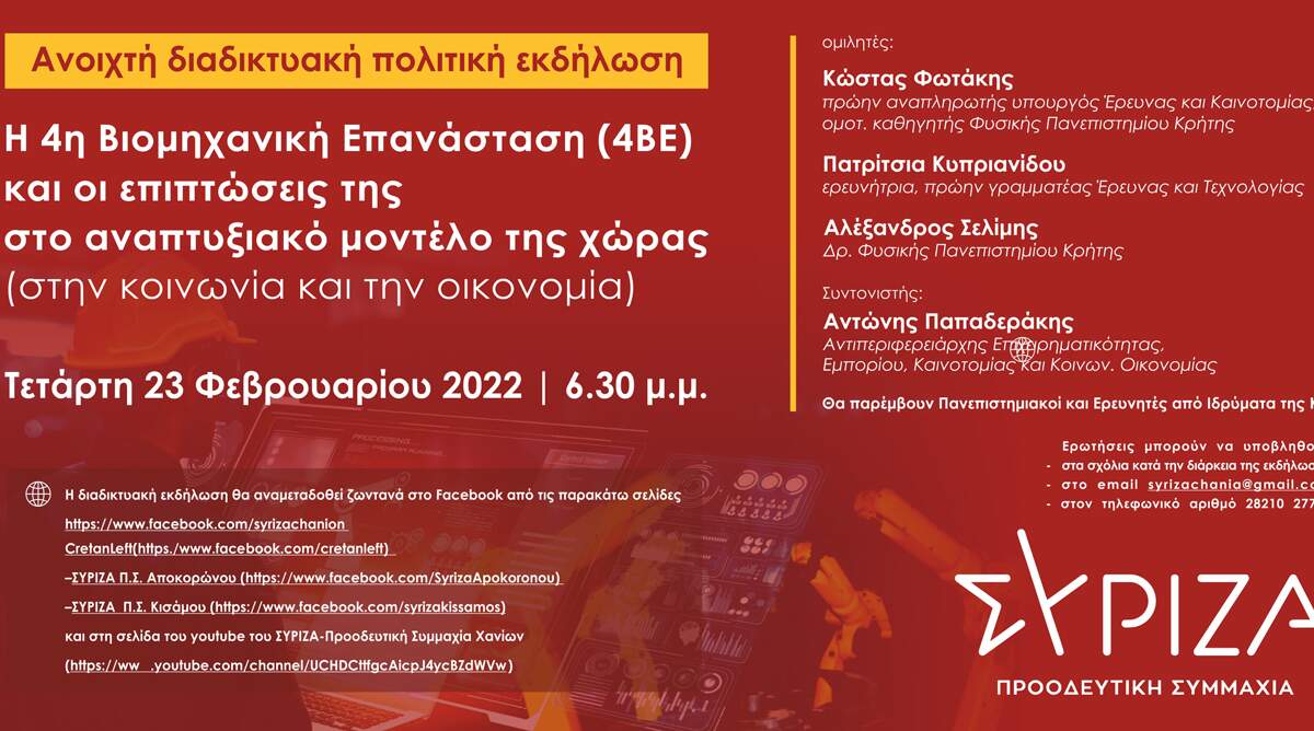 Ανοιχτή διαδικτυακή Πολιτική Εκδήλωση διοργανώνει ο ΣΥΡΙΖΑ – ΠΣ Χανίων με θέμα: Η 4η Βιομηχανική Επανάσταση (ΒΕ) και οι επιπτώσεις της στο αναπτυξιακό μοντέλο της χώρας (Στην κοινωνία και την οικονομία)“, η οποία θα πραγματοποιηθεί την Τετάρτη 23 Φεβρουαρίου 2022, ώρα 18:30 (6:30 μ.μ.)