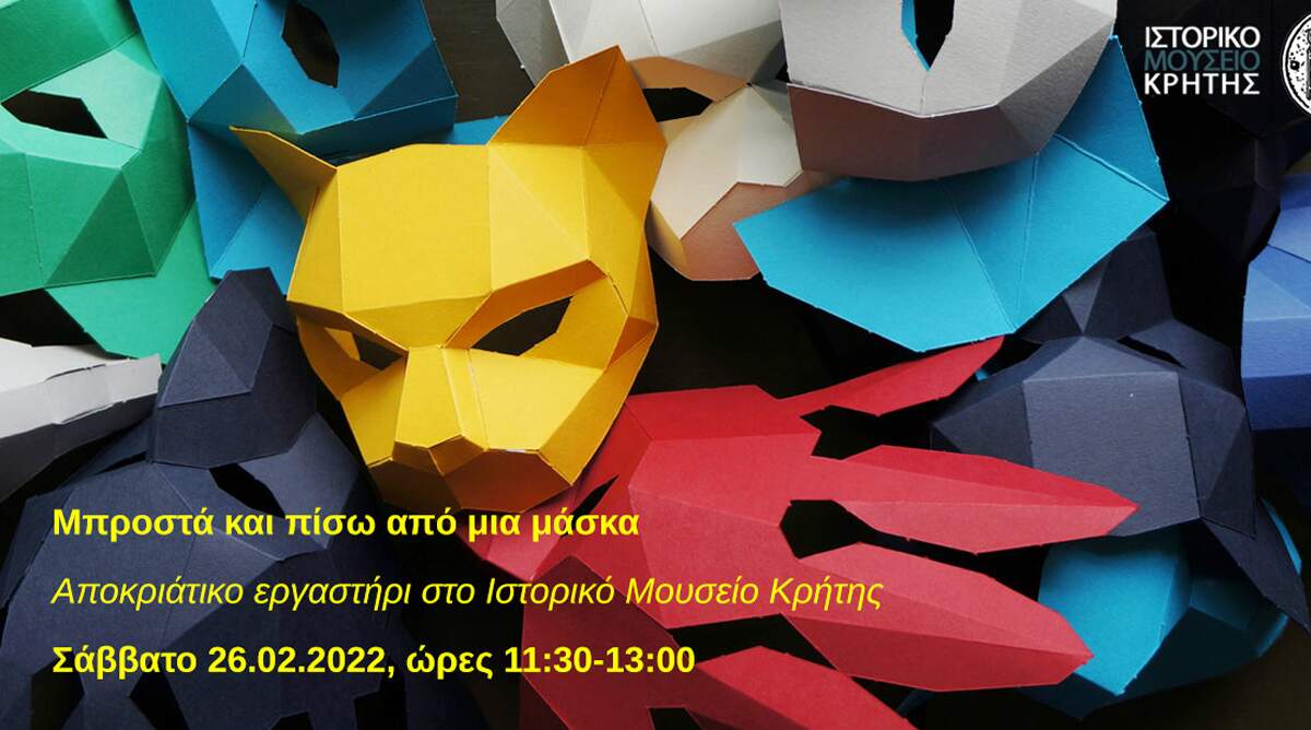 Το Ιστορικό Μουσείο Κρήτης προσκαλεί τα παιδιά σε ένα ταξίδι στον κόσμο της μάσκας, το Σάββατο 26 Φεβρουαρίου 2022, 11:30-13:00. Παρέα θα εξερευνήσουμε την ιστορία της μάσκας από τα προϊστορικά χρόνια ως σήμερα. Μέσα από την τέχνη, τη λογοτεχνία, τη μουσική θα ανακαλύψουμε μάσκες πραγματικές, αλλά και αόρατες, μάσκες που μας απελευθερώνουν και άλλες που μας περιορίζουν. Θα δημιουργήσουμε τη δική μας μάσκα που θα φέρει τα μοναδικά χαρακτηριστικά του καθενός και της καθεμιάς μας.
