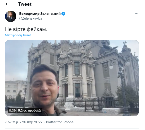 Κάλεσε τους Ουκρανούς να μην πιστεύουν τiς “ψευδείς πληροφορίες” που κυκλοφορούν στο διαδίκτυο σύμφωνα με τις οποίες κάλεσε τον στρατό να παραδοθεί.