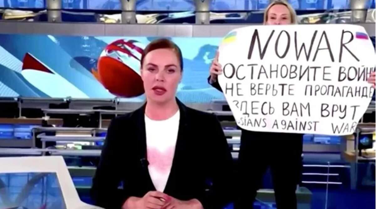 Η Μαρίνα Οβσιανίκοβα εμφανίσθηκε κατά τη διάρκεια του τηλεοπτικού δελτίου του προσκείμενου στο Κρεμλίνο Pervy Kanal (1ο Κανάλι) πίσω από την τηλεπαρουσιάστρια, κρατώντας ένα πλακάτ που έγραφε «Όχι στον Πόλεμο. Μην πιστεύετε την προπαγάνδα. Εδώ, σας λένε ψέματα» και μετά τη σύλληψή της αναμενόταν να οδηγηθεί στο δικαστήριο της Οστάνκινο στη Μόσχα.