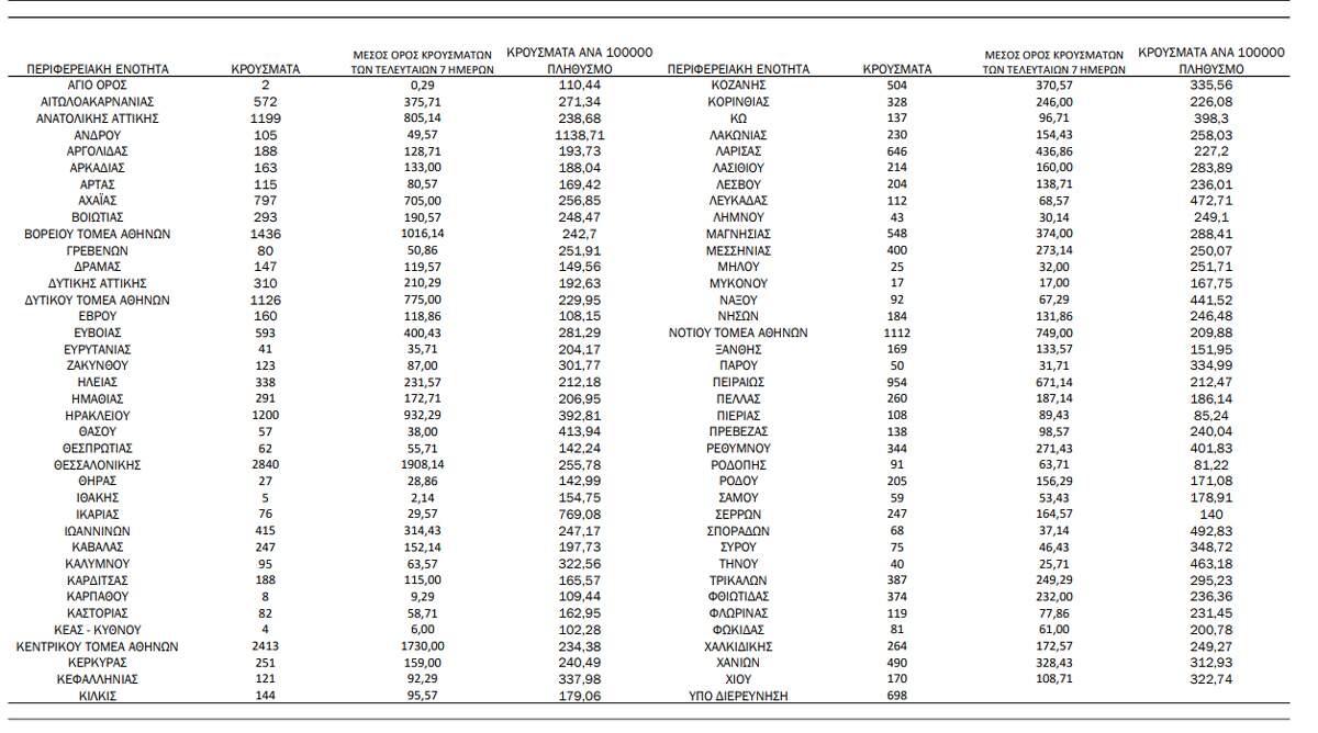 Τα νέα εργαστηριακά επιβεβαιωμένα κρούσματα της νόσου που καταγράφηκαν τις τελευταίες 24 ώρες είναι 26.536, εκ των οποίων 27 εντοπίστηκαν κατόπιν ελέγχων στις πύλες εισόδου της χώρας. Ο συνολικός αριθμός των κρουσμάτων ανέρχεται σε 2.684.916 (ημερήσια μεταβολή +1.0%), εκ των οποίων 49.3% άνδρες. Με βάση τα επιβεβαιωμένα κρούσματα των τελευταίων 7 ημερών, 201 θεωρούνται σχετιζόμενα με ταξίδι από το εξωτερικό και 1.391 είναι σχετιζόμενα με ήδη γνωστό κρούσμα.