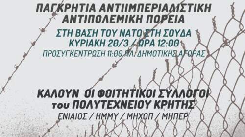 Στην παγκρήτια αντιπολεμική κινητοποίηση που θα πραγματοποιηθεί την Κυριακή στη βάση της Σούδας, συμμετέχουν οι φοιτητικοί σύλλογοι του Πολυτεχνείου Κρήτης. Μαζί με σωματεία, συλλογικότητες και οργανώσεις των Χανίων, οι φοιτητές θα συγκεντρωθούν στις 11 το πρωΐ της Κυριακής στην πλατεία Δημοτικής Αγοράς και στην συνέχεια θα πραγματοποιήσουν πορεία προς τη βάση της Σούδας. «Καταγγέλλουμε την απαράδεκτη απόφαση της ελληνικής κυβέρνησης…