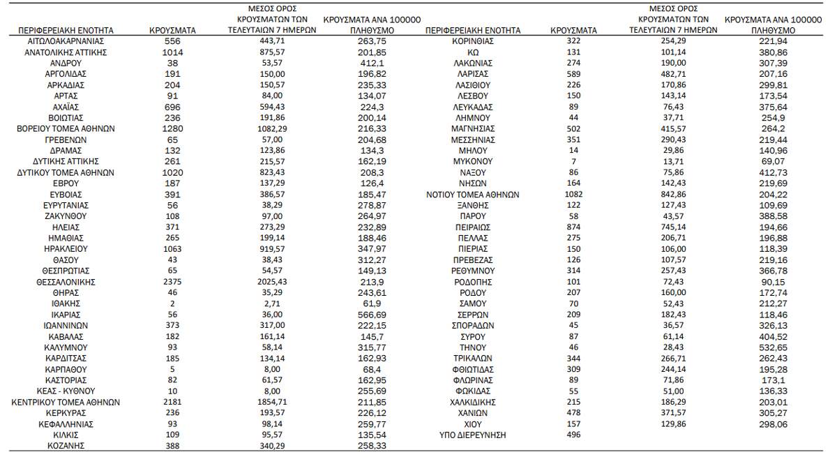 Ο συνολικός αριθμός των κρουσμάτων ανέρχεται σε 2.756.487 (ημερήσια μεταβολή +0.9%), εκ των οποίων 49.3% άνδρες. Με βάση τα επιβεβαιωμένα κρούσματα των τελευταίων 7 ημερών, 196 θεωρούνται σχετιζόμενα με ταξίδι από το εξωτερικό και 1.802 είναι σχετιζόμενα με ήδη γνωστό κρούσμα.