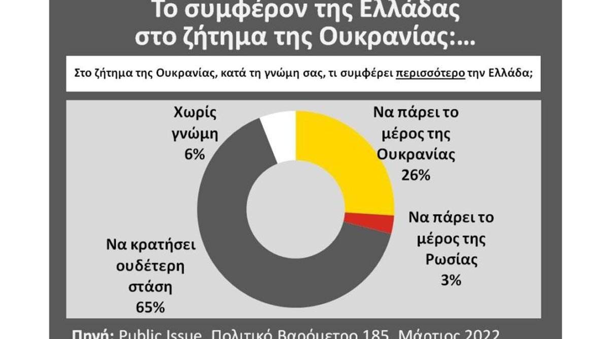 - Το 65% τονίζει ότι το συμφέρον της Ελλάδας στο ζήτημα της Ουκρανίας είναι να κρατήσει ουδέτερη στάση.