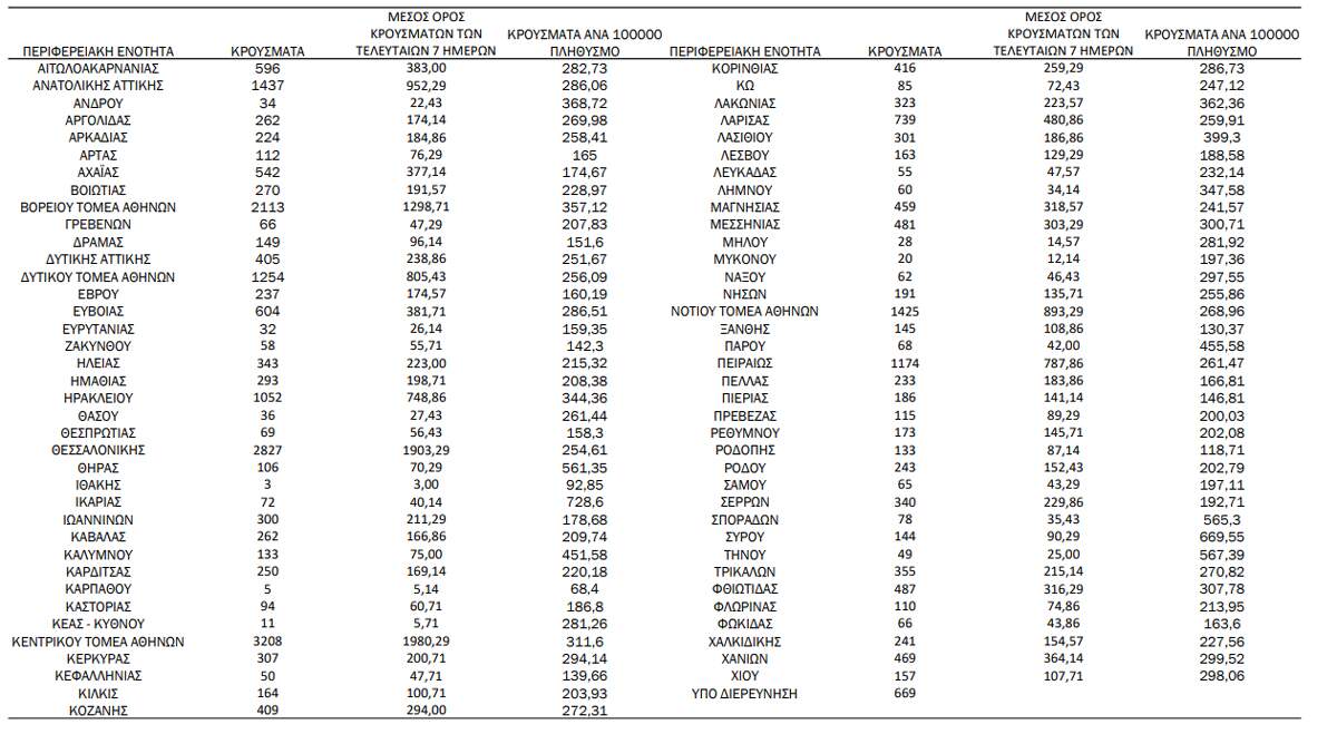 Ο συνολικός αριθμός των κρουσμάτων ανέρχεται σε 2.986.882 (ημερήσια μεταβολή +1.0%), εκ των οποίων 49.2% άνδρες. Με βάση τα επιβεβαιωμένα κρούσματα των τελευταίων 7 ημερών, 166 θεωρούνται σχετιζόμενα με ταξίδι από το εξωτερικό και 1.226 είναι σχετιζόμενα με ήδη γνωστό κρούσμα.
