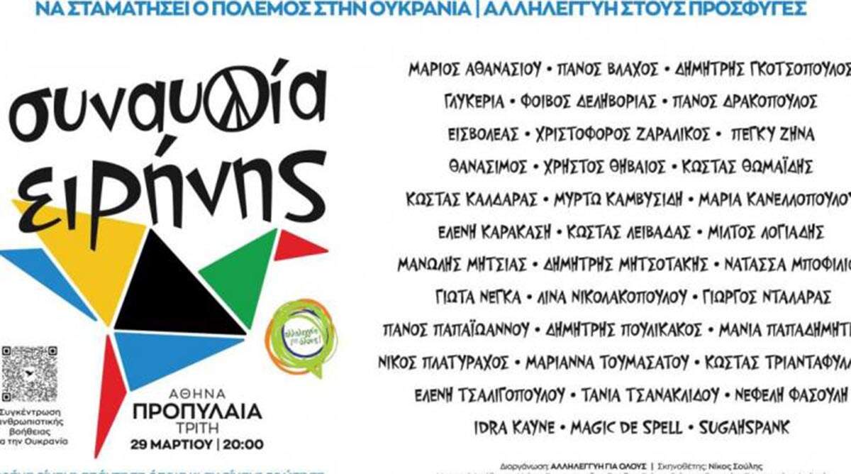 Παρά τις «βολές» όσων προσπάθησαν να ειρωνευτούν και να υποβαθμίσουν την μεγάλη συναυλία ειρήνης, θα πραγματοποιηθεί σήμερα Τρίτη 29 Μαρτίου στα Προπύλαια στις 8 μ.μ. Στην συναυλία που διοργανώνει η «Αλληλεγγύη για Όλους» θα συμμετέχουν δεκάδες καλλιτέχνες, οι οποίοι τις προηγούμενες μέρες έδωσαν ένα σαφές αντιπολεμικό μήνυμα, επισημαίνοντας πως θα τραγουδήσουν για την ειρήνη, για να σταματήσει η ρωσική εισβολή στην Ουκρανία και να σιγήσουν τα όπλα.