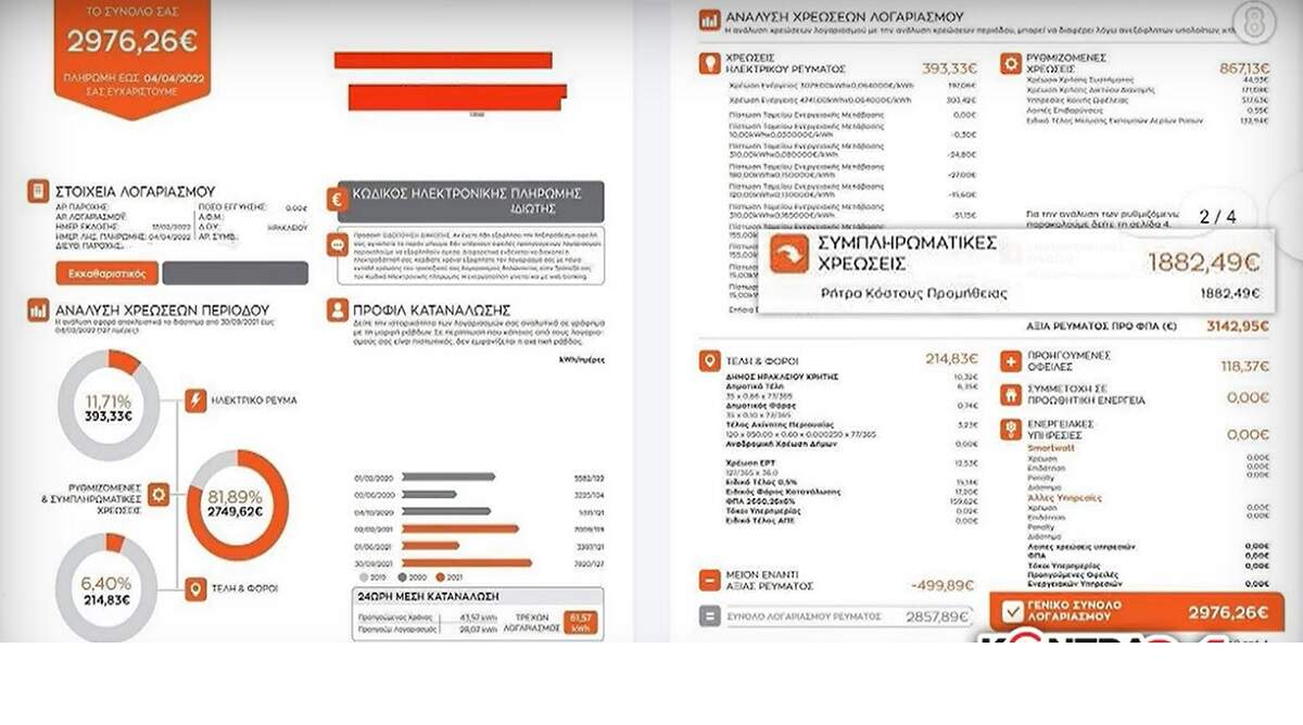 Την υπόθεση αποκάλυψε η δημοσιογράφος Αναστασία Γιάμαλη στο δελτίο ειδήσεων του KONTRA 24. Συγκεκριμένα, μια μητέρα και τα δύο ενήλικα παιδιά της έλαβαν λογαριασμό ρεύματος 2.976,26 ευρώ με τα 2.749 να είναι η ρήτρα αναπροσαρμογής, οπότε το ηλεκτρικό ρεύμα που κατανάλωσε η οικογένεια είναι μόνο το 11,71% του λογαριασμού. Για τέλη και φόρους η οικογένεια καλείται να πληρώσει 204 ευρώ που αποτελεί το 6,4% του λογαριασμού που υπόκειται σε συμβόλαιο κλειστό για δύο χρόνια.