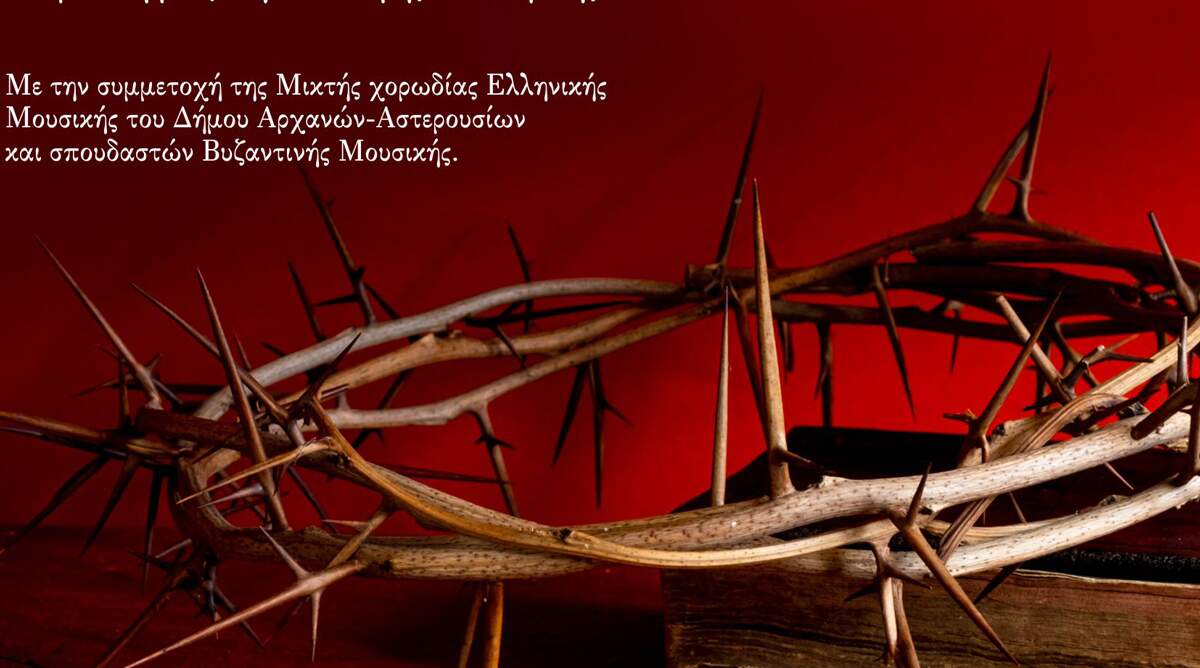 Με την συνδιοργάνωση της Περιφέρειας Κρήτης θα παρουσιαστεί το Βυζαντινό Ορατόριο «Ω, Γλυκύ Μου Έαρ», το Σάββατο 9 Απριλίου 2022 στο κινηματοθέατρο «ΑΣΤΟΡΙΑ» στις 20:30 το βράδυ. Πρόκειται για ένα έργο που θα περιλαμβάνει ύμνους της Μεγάλης Εβδομάδας, μοιρολόγια και τραγούδια, με την συνοδεία μουσικής και με παράλληλη θεατρική απόδοση, εκτελεσμένο από την Μικτή Χορωδία Ελληνικής Μουσικής του Δήμου Αρχανών-Αστερουσίων μαζί με σπουδαστές Βυζαντινής Μουσικής, σε συνεργασία με μουσικούς και ηθοποιούς.