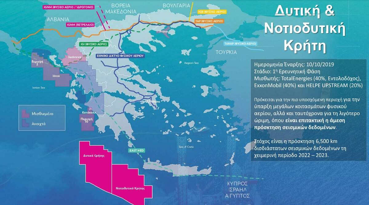 Στις περιοχές της Κρήτης, η ερευνητική κοινοπραξία αποτελείται από τις εταιρίες Total (40%), ExxonMobil (40%) και Ελληνικά Πετρέλαια (20%), Σύμφωνα με την παρουσίαση της ΕΔΕΥ, πρόκειται για την πιο υποσχόμενη περιοχή για την ύπαρξη μεγάλων κοτασμάτων φυσικού αερίου, αλλά και ταυτόχρονα για τη λιγότερο ώριμη, όπου είναι επιτακτική ανάγκη η άμεση πρόσκτηση σεισμικών δεδομένων. Στόχος είναι η πρόσκτηση 6,500 χιλιομέτρων δισδιάστατων σεισμικών δεδομένων τη χειμερινή περίοδο 2022-2023. Τον επόμενο χρόνο ακολουθούν οι τρισδιάστατες δονήσεις, ενώ από το 2025 έως το 2026, σύμφωνα με το χρονοδιάγραμμα, θα πραγματοποιηθούν οι πρώτες ερευνητικές γεωτρήσεις. Ακολουθεί η ανάπτυξη του κοιτάσματος και η διαδικασία της εκμεταλλευσιμότητας (2027-2029), μέχρι την παραγωγή το 2030 στην Κρήτη.