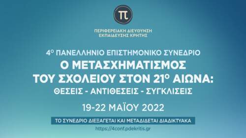 Ο μετασχηματισμός του σχολείου στον 21ο αιώνα: Θέσεις – Αντιθέσεις – Συγκλίσεις είναι ο τίτλος του 4ου Πανελλήνιου Επιστημονικού Συνεδρίου που διοργανώνει η Περιφερειακή Διεύθυνση Πρωτοβάθμιας και Δευτεροβάθμιας Εκπαίδευσης Κρήτης. Οι εργασίες του θα πραγματοποιηθούν εξ αποστάσεως από 19 έως 22 Μαΐου 2022. Σκοπός του Συνεδρίου είναι να προωθήσει τον γόνιμο και δημιουργικό διάλογο ανάμεσα στα μέλη της εκπαιδευτικής κοινότητας,…