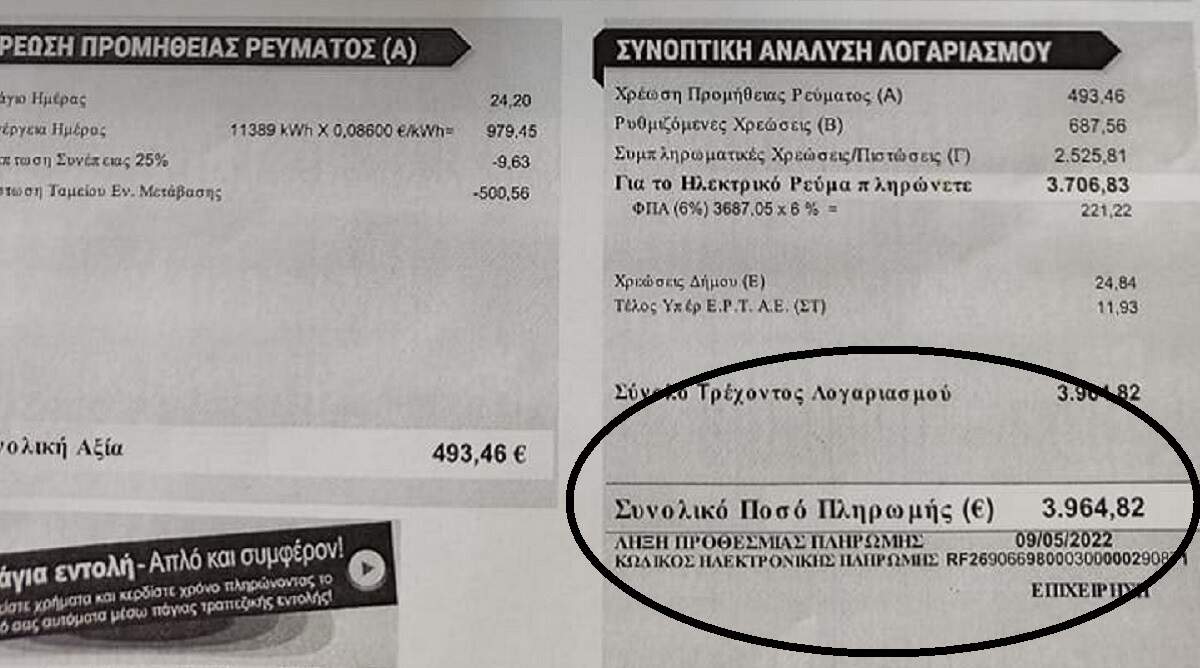 Σίγουρα του ήρθε όχι απλώς ξαφνικό, αλλά μάλλον… νταμπλάς! Κρητικός βιοτέχνης καλείται να πληρώσει στο ρεύμα σχεδόν 4.000 ευρώ! Μάλιστα ο ίδιος σημειώνει ότι αντί να πληρώσει 946 ευρώ, με βάση τη συμφωνία που έκανε με την ιδιωτική εταιρεία, πληρώνει άλλα 2.750 για τη ρήτρα αναπροσαρμογής!