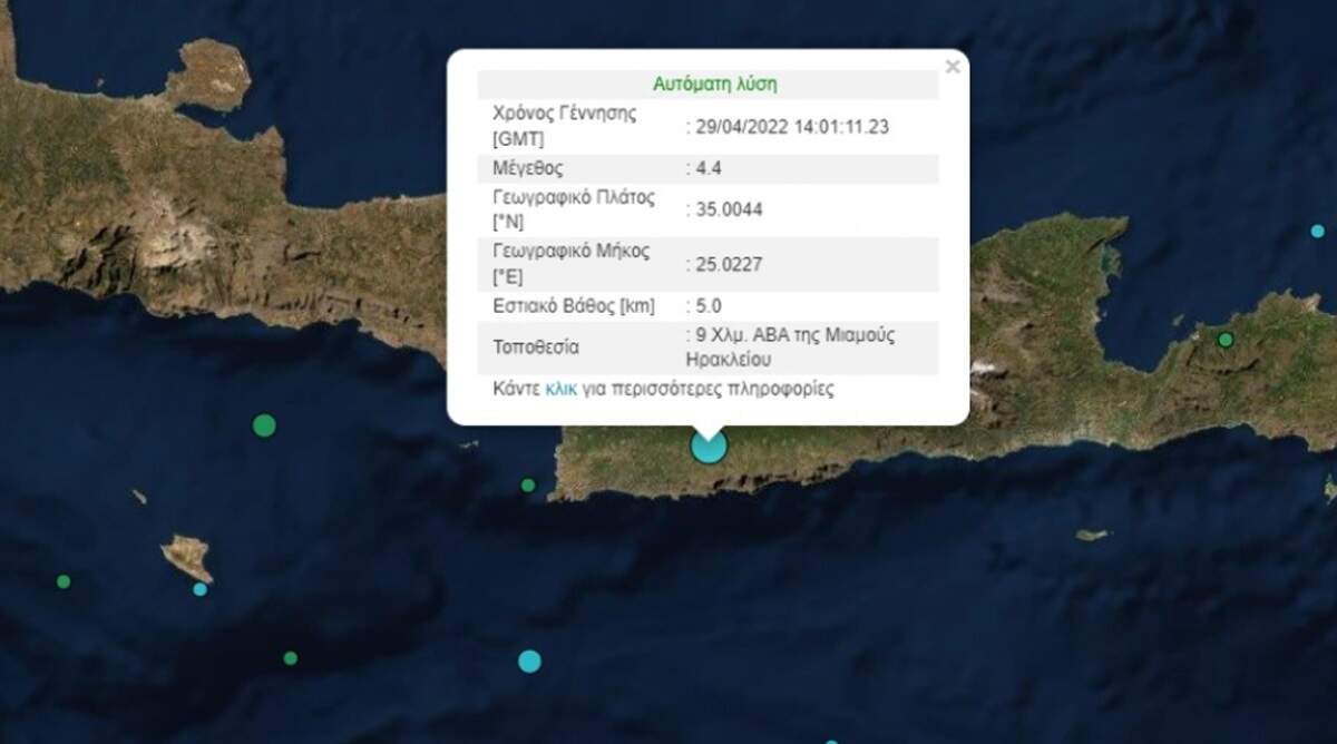 Ισχυρή σεισμική δόνηση μεγέθους 4,4 Ρίχτερ σημειώθηκε στις 5.01 το απόγευμα 9 Χλμ. ανατολικά βορειοανατολικά της Μιαμούς Ηρακλείου σύμφωνα με την αυτόματη λύση του Γεωδυναμικού Ινστιτούτου. Το εστιακό βάθος εκτιμάται στα 5 χιλιόμετρα και έγινε αισθητός σε όλο το νησί.