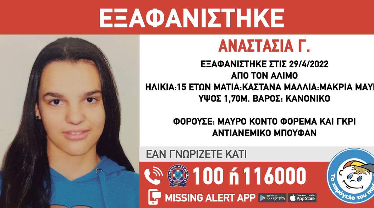 Στις 29.04.2022, απογευματινές ώρες, εξαφανίστηκε από την περιοχή του Αλίμου, η Αναστασία Γ., 15 ετών.