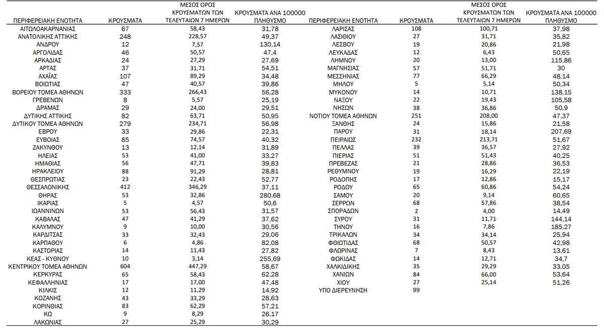 Τα νέα εργαστηριακά επιβεβαιωμένα κρούσματα της νόσου(άτομα) που καταγράφηκαν τις τελευταίες 24 ώρες ήταν 4.388. Ο συνολικός αριθμός των ατόμων που νόσησαν ανέρχεται σε 3.384.982 (ημερήσια μεταβολή +0.1%), εκ των οποίων 48.8% άνδρες.