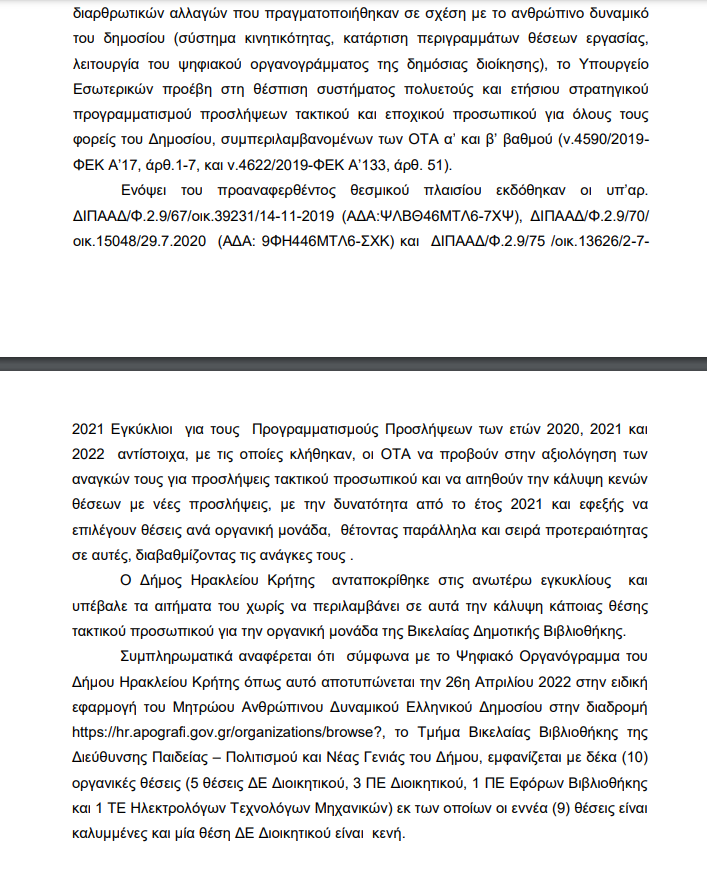 Και δεν είναι μόνο το ελάχιστο προσωπικό. Είναι το γεγονός ότι όταν ακόμα και αυτή η κυβέρνηση Μητσοτάκη με υπουργό Εσωτερικών τον γνωστό Βορίδη ζήτησε από τους ΟΤΑ προγραμματισμό προσλήψεων με σύμβαση, ο δήμος Ηρακλείου δεν συμπεριέλαβε ποτέ τη Βικελαία στις προτάσεις του…