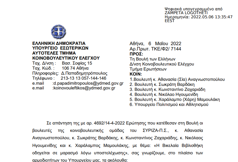 Δείτε την απάντηση του στην ερώτηση που κατέθεσε ο ΣΤΡΙΖΑ-ΠΣ με πρωτοβουλία της τομεάρχη Πολιτισμού ΣΥΡΙΖΑ – Προοδευτική Συμμαχία και βουλεύτριας Αχαΐας, Σίας Αναγνωστοπούλου, με τη συνυπογραφή των βουλευτών Ηρακλείου Σωκράτη Βαρδάκη, Νίκου Ηγουμενίδη, Χάρη Μαμουλάκη και του τομεάρχη Εσωτερικών Κώστα Ζαχαριάδη: