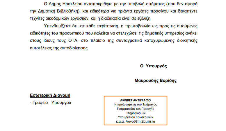 Βέβαια μετά που ο δήμαρχος Ηρακλείου πήρε την απάντηση Βορίδη στα χέρια του, άρχισε να “τρέχει”. Αλλά τι έπραξε; Έβαλε το ΔΣ να πάρει απόφαση για ενίσχυση της Βικελαίας με 3 άτομα (ούτε αν φτάνουν για τις ανάγκες), αλλά με δυο από αυτά να είναι πλέον γνωστά σε όλο το δήμο: από τον κύκλο της δημοτικής αρχής!