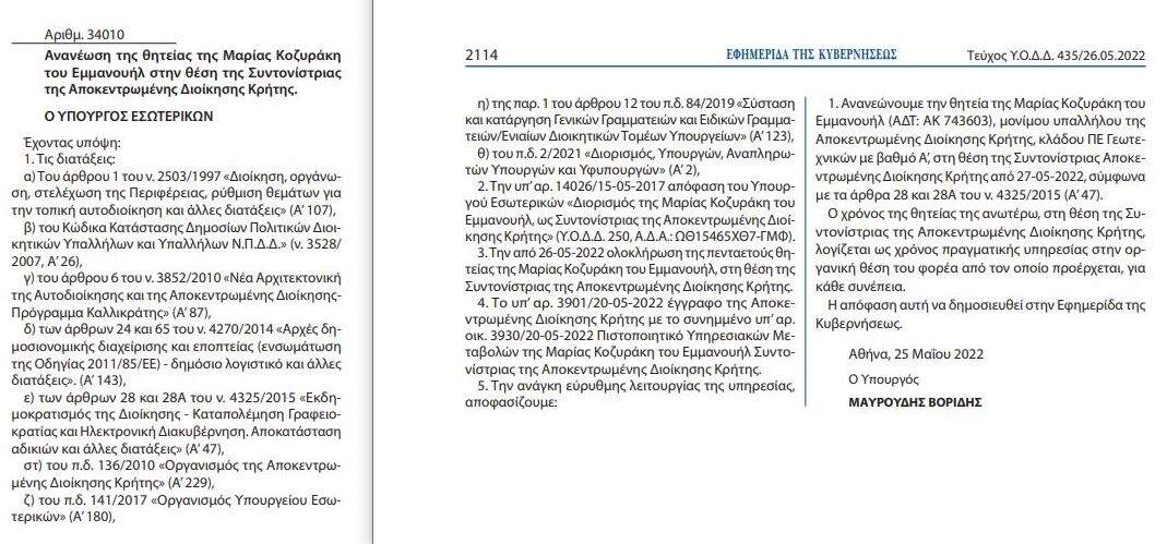 Με την αριθμ. 34010/25-5-2022 απόφαση (ΦΕΚ 435/26-5-2022 τ. Υ.Ο.Δ.Δ.) του Υπουργού Εσωτερικών κ. Μαυρουδή Βορίδη, ανανεώθηκε η θητεία  της  Μαρίας Κοζυράκη στη θέση της Συντονίστριας της Αποκεντρωμένης Διοίκησης Κρήτης.