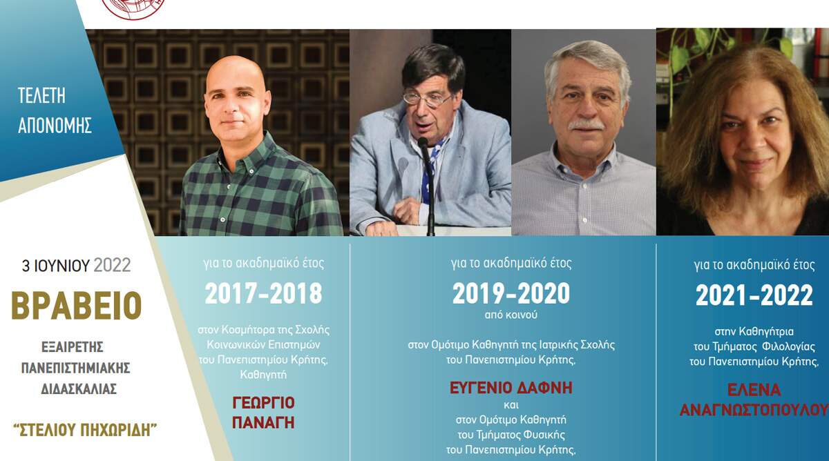 Το Πανεπιστήμιο Κρήτης θα απονείμει τα Βραβεία Εξαίρετης Πανεπιστημιακής Διδασκαλίας «ΣΤΕΛΙΟΥ ΠΗΧΩΡΙΔΗ» για τα Ακαδημαϊκά έτη 2017-2018, 2019 -2020 (δεν απονεμήθηκαν Βραβεία λόγω της πανδημίας COVID-19) και 2021 -2022, την Παρασκευή 3 Ιουνίου 2022 και ώρα 19:00 στην αίθουσα «Καστελλάκη» του Επιμελητηρίου Ηρακλείου.