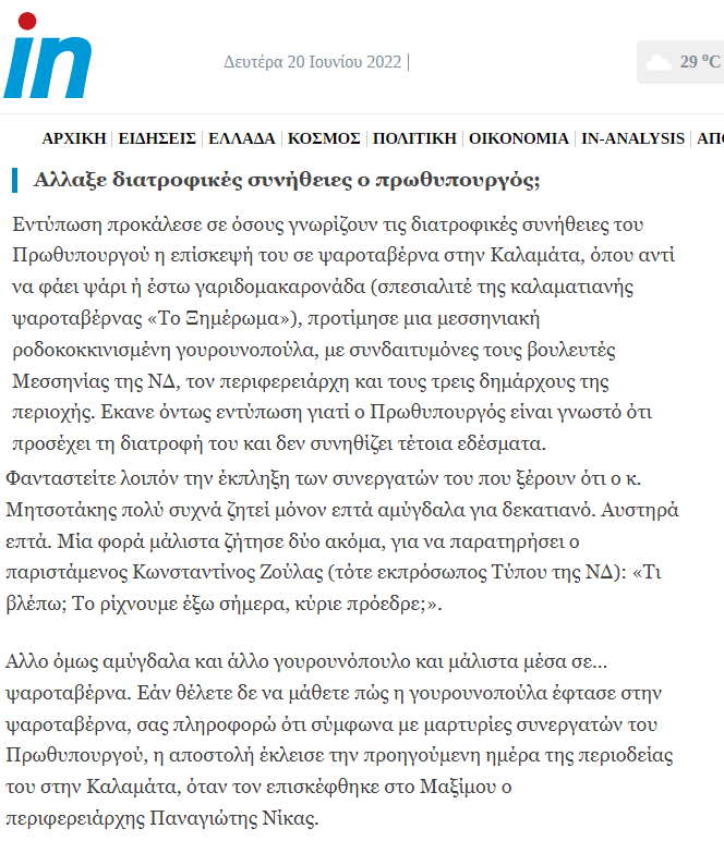 Τελευταία απόπειρα έγινε από το γνωστό για τις θέσεις του in.gr, στο οποίο διαβάσαμε με έκπληξη την είδηση ότι ο πρωθυπουργός πήγε σε ψαροταβέρνα στην Καλαμάτα και «προτίμησε μια μεσσηνιακή ροδοκοκκινισμένη γουρουνοπούλα», αντί για «ψάρι ή έστω γαριδομακαρονάδα» η οποία φέρεται αν είναι η σπεσιαλιτέ της καλαματιανής ψαροταβέρνας.