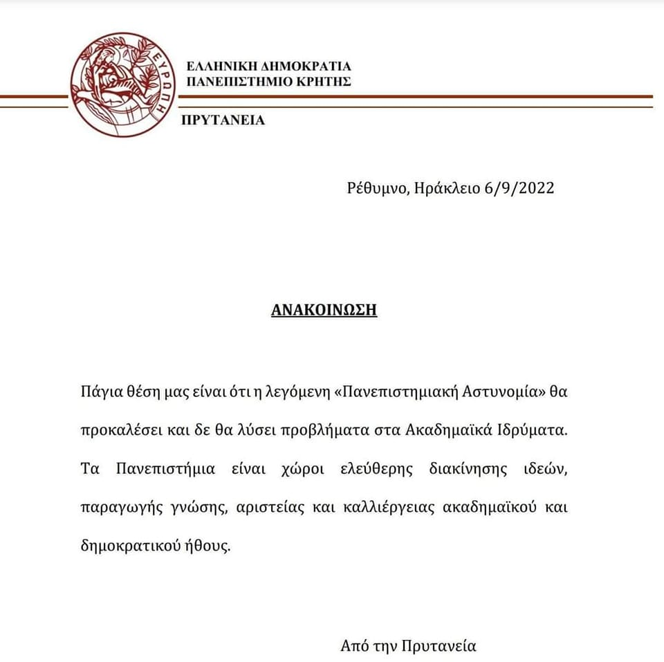 Κατά της εγκατάστασης της Πανεπιστημιακής Αστυνομίας στους χώρους του τάσσεται για μια ακόμα φορά το Πανεπιστήμιο Κρήτης, σύμφωνα με ανακοίνωση που εξέδωσε η Πρυτανεία.