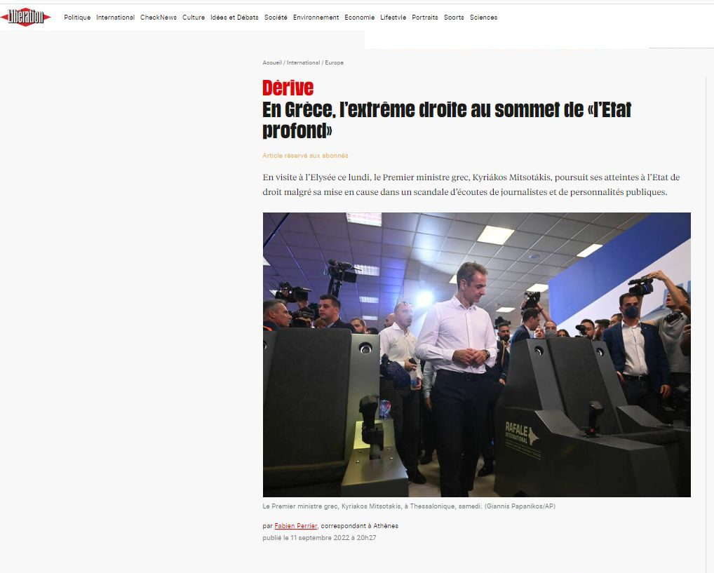 Δεν έχει τέλος ο διεθνής διασυρμός της κυβέρνησης Μητσοτάκη για το σκάνδαλο των υποκλοπών στην Ελλάδα. Σήμερα, με αφορμή την επίσκεψη του Κυριάκου Μητσοτάκη στο Παρίσι και τη συνάντησή του με τον Γάλλο πρόεδρο Εμανουέλ Μακρόν, είναι η σειρά της Liberation να αναδείξει την υπόθεση, φιλοξενώντας εκτενές ρεπορτάζ-κόλαφο με τίτλο «Στην Ελλάδα η ακροδεξιά είναι επικεφαλής του “βαθέως κράτους”».