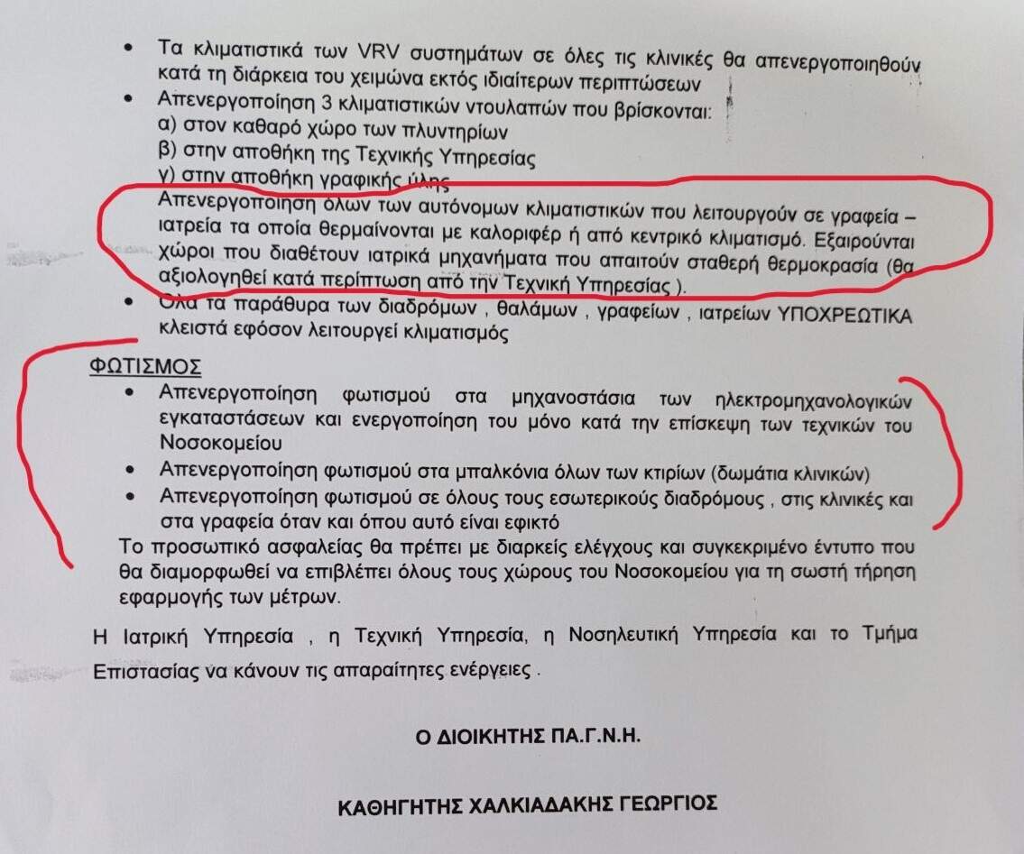 Με απόφαση του διοικητή του ΠΑΓΝΗ για τη μείωση της κατανάλωσης ηλεκτρικής ενέργειας, τα καλοριφέρ των κλινικών θα παραμένουν κλειστά το χειμώνα από τις 8πμ έως τις 6μμ, ενώ παράλληλα, θα απενεργοποιηθούν τα κλιματιστικά και ο φωτισμός σε εσωτερικούς διαδρόμους, μπαλκόνια και κλινικές! Την αποκάλυψη κάνει το σωματείο Εργαζομένων του νοσοκομείου, παρουσιάζοντας και το σχετικό έγγραφο
