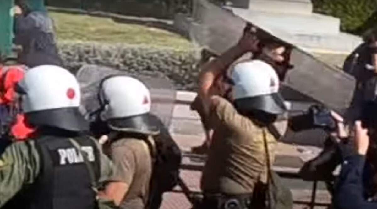 Τη στιγμή που αστυνομικός των ΜΑΤ χτυπάει με την ασπίδα του στο κεφάλι φοιτήτρια κατέγραψε η κάμερα του Newsbeast. Το περιστατικό σημειώθηκε το μεσημέρι της Πέμπτης (20/10) μπροστά από τα Προπύλαια ενώ βρισκόταν σε εξέλιξη το συλλαλητήριο κατά της πανεπιστημιακής αστυνομίας.