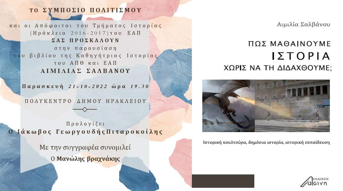 Το «Συμπόσιο Πολιτισμού», ανταποκρινόμενο στις αγωνίες των πολιτών για έναν κριτικό επαναστοχασμό, διοργανώνει εκδήλωση σε συνεργασία με τους αποφοίτους του Τμήματος Ιστορίας του ΕΑΠ, παρουσιάζοντας το βιβλίο της Καθηγήτριας Ιστορίας του ΑΠΘ και του ΕΑΠ, Αιμιλίας Σαλβάνου, με τίτλο: «Πώς μαθαίνουμε Ιστορία χωρίς να τη διδαχθούμε;», εκδόσεις Ασίνη. Η εκδήλωση θα πραγματοποιηθεί την Παρασκευή 21/10/2022 και ώρα 19.30 στο Πολύκεντρο του Δήμου Ηρακλείου. Θα προλογίσει ο Ιάκωβος Γεωργουδής – Πιταροκοίλης ενώ με την συγγραφέα θα συνομιλήσει ο Μανώλης Βραχνάκης και εν συνεχεία θα ακολουθήσει διάλογος με το κοινό.