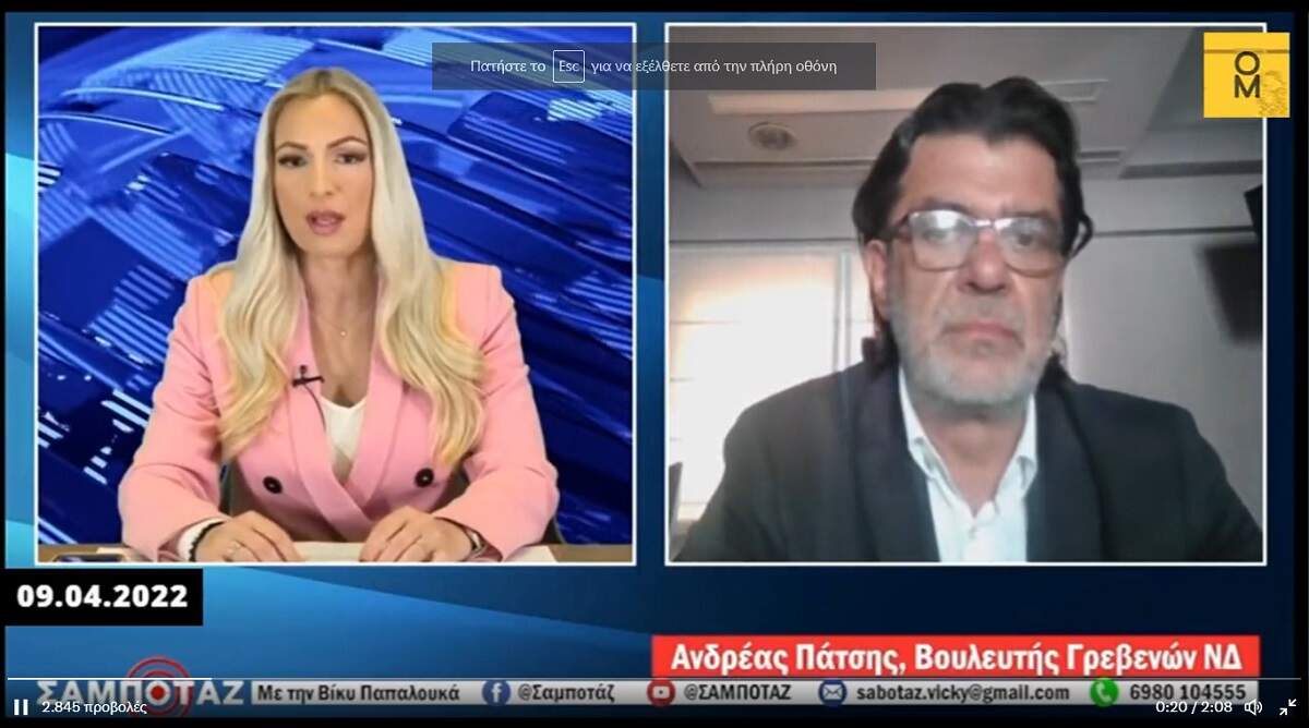 Δείτε το βίντεο, αν αντέξετε, για να καταλάβατε το καθεστώς των “αρίστων” του Μητσοτάκη! Ο βουλευτής Γρεβενών, Ανδρέας Πάτσης, που διαγράφηκε σήμερα από τη ΝΔ (μετά από 3 χρόνια σιωπής και συνενοχής στη δράση του) δίνει συνέντευξη στην εκπομπή της συζύγου του. Βίκυς Παπαλουκά! Τους πάντρεψε ο Στέλιος Πέτσας, τους έδωσε και χρήμα από τη “λίστα Πέτσα”, ενώ παρόντες ήταν πολλοί από την ηγεσία της ΝΔ.