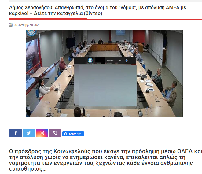 Την απομάκρυνση του προέδρου της Κοινωφελούς Επιχείρησης του δήμου Χερσονήσου, “πρωταγωνιστή” διαφόρων θλιβερών χειρισμών στον ΟΤΑ με πιο πρόσφατη την απόλυση εργαζόμενης ΑΜΕΑ με καρκίνο, στην οποία παρακράτησε και μέρος των μισθών, χωρίς καν απόφαση του ΔΣ, ζητά η πλειοψηφία του δημοτικού συμβουλίου. ΟΙ 17 από τους 27 συμβούλους ζητούν την επιστροφή της εργαζόμενης στη θέση της, ενώ καταγγέλλουν τον πρόεδρο και για άλλη ανάλογη υπόθεση με διαχείριση κονδυλίων.