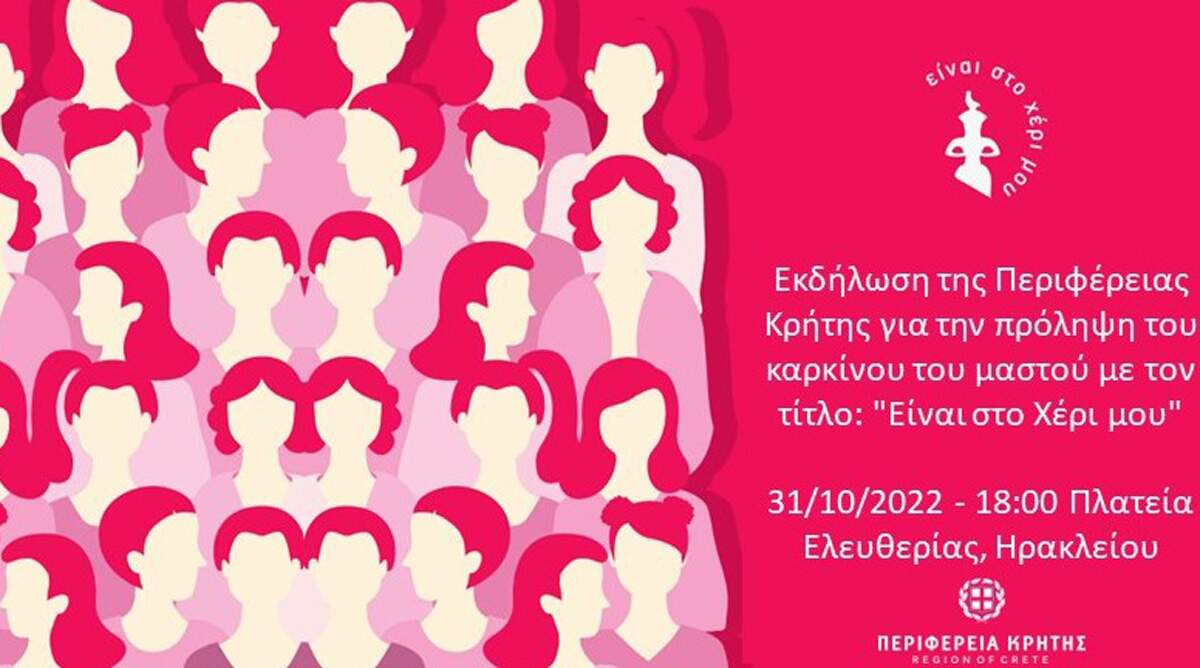 Η διαδρομή για την πρόληψη και την αντιμετώπιση του καρκίνου του μαστού δεν σταματά ποτέ. Για την Περιφέρεια Κρήτης είναι ένας διαρκής αγώνας για τη ζωή. Μέσα από την καμπάνια ΄΄ΕΙΝΑΙ ΣΤΟ ΧΕΡΙ ΜΟΥ΄΄ και την κινητή μονάδα μαστογράφου σε κάθε σημείο της παρέμβασής μας, μαζί με τις χιλιάδες γυναίκες που ανταποκρίνονται στο κάλεσμά μας, για μαστογραφικό έλεγχο και πρόληψη , στέλνουμε ένα ξεκάθαρο μήνυμα: ότι ο καρκίνος του μαστού δεν είναι αήττητος, αλλά μπορεί να προληφθεί και να αντιμετωπιστεί με επιτυχία. Αυτή την αισιόδοξη πλευρά της ζωής, προσπαθούμε να αναδείξουμε μέσα από τη συνέχιση, ενίσχυση και διεύρυνση των δράσεων της Περιφέρειας Κρήτης. Έχοντας συμμάχους και συνοδοιπόρους φορείς και ανθρώπους που εθελοντικά συμμετέχουν σε αυτή τη συλλογική και ανθρώπινη προσπάθεια, δομούμε μια «αλυσίδα ζωής». Σε αυτήν κάθε κρίκος «είναι στο χέρι» της κάθε γυναίκας που προνοεί και προλαμβάνει.
