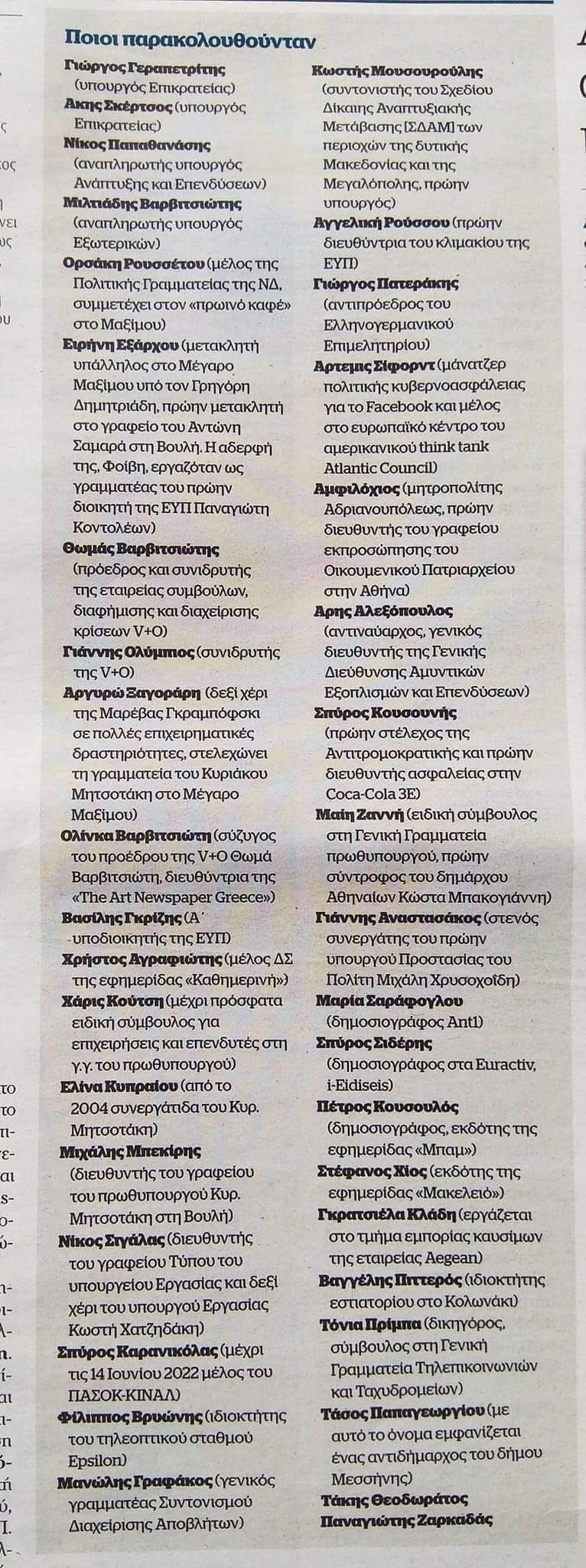 Γιατί όπως ξεκαθαρίζει ο Κώστας Βαξεβάνης: «Η λίστα που δημοσιεύουμε σήμερα (έχοντας πολλά στοιχεία που την επιβεβαιώνουν στη διάθεσή μας), αποδεικνύει αυτό που υπήρχε ως υποψία. Το δίχτυ των συνακροάσεων, ήταν ουσιαστικά το δίκτυ προστασίας του καθεστώτος. Σε τη παρακολούθηση ήταν “περιοχές” και πρόσωπα του Μαξίμου , ενώ ο κοριός άκουγε έμμεσα και την Πρόεδρο της Δημοκρατίας. Η διαστροφική πολιτικά και επικίνδυνη θεσμικά πρακτική με τον αδιαμφισβήτητο πλέον εντολέα, δεν άφηνε έξω από το πεδίο ενδιαφέροντος τα προσωπικά θέματα, τα οποία απ ό,τι φαίνεται- έτσι τουλάχιστον ισχυρίζονται τα βαθιά λαρύγγια του Mitsotakis_gate-, χρησιμοποιούνταν για προσωπικούς εκβιασμούς και χειραγώγηση των άτακτων υπουργών».