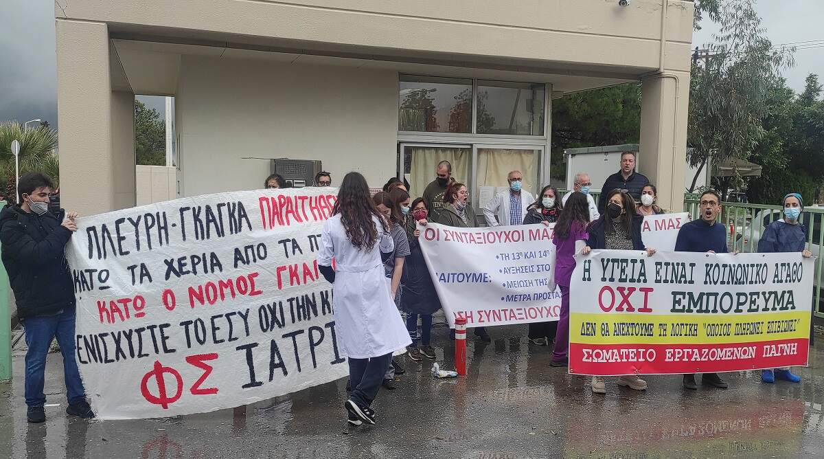 Μαχητική παράσταση διαμαρτυρίας πραγματοποιήθηκε από το Σωματείο Εργαζομένων ΠαΓΝΗ με τη συμμετοχή της Ένωσης Συνταξιούχων ΙΚΑ Ηρακλείου, του Συλλόγου Φοιτητών Ιατρικής και της τριμελούς επιτροπής των ιατρών ΕΣΥ του ΠΑΓΝΗ ενάντια στο νομοσχέδιο-ταφόπλακα που κατέθεσε η κυβέρνηση για τη δευτεροβάθμια περίθαλψη και ξεθεμελιώνει ότι έχει μείνει δημόσιο στο ΕΣΥ.