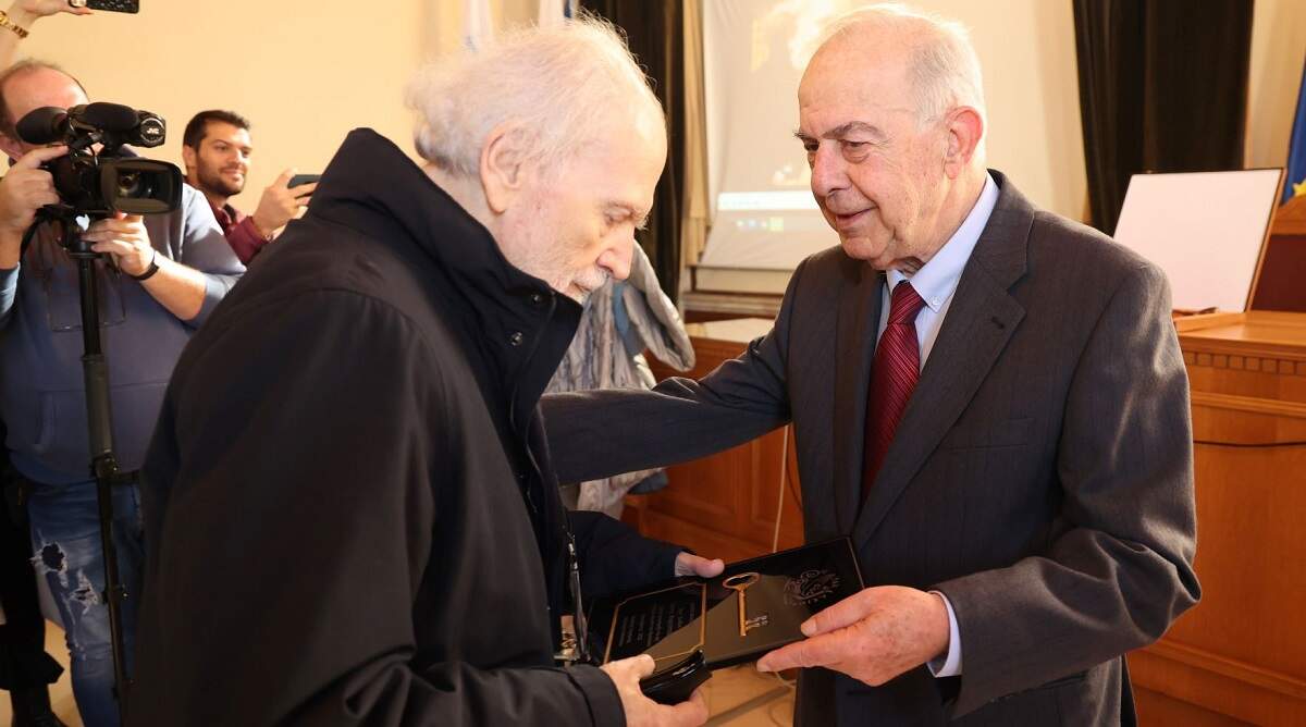 Τον τίτλο του Επίτιμου Δημότη καθώς και το «Κλειδί» της πόλης απένειμε στον μεγάλο καλλιτέχνη ο Δήμαρχος Ηρακλείου Βασίλης Λαμπρινός, ο οποίος στον σύντομο χαιρετισμό του ανέφερε: