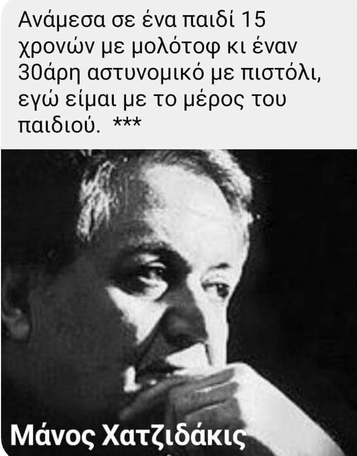 «Όταν έχω να κρίνω ανάμεσα σ’ ένα παιδί 15 χρόνων, που πετάει μολότοφ, κι έναν τριαντάρη εκπαιδευμένο αστυνομικό, που κρατάει πιστόλι, εγώ είμαι με το μέρος του παιδιού και όχι του αστυνομικού. Εκτιμώ βαθύτατα ένα παιδί που εξεγείρεται και βγαίνει στους δρόμους για να διαμαρτυρηθεί, έστω κι αν υπερβάλλει, έστω και αν κρατάει μολότοφ. Και δεν εκτιμώ καθόλου έναν αστυνομικό που το πυροβολεί. Ό,τι και αν έχει γίνει, όπως και αν έχουν τα πράγματα, θεωρώ τραγικό λάθος την αθώωση του αστυνομικού. Και πολύ κακό μήνυμα, που στέλνουμε στα νέα αυτά παιδιά, το υγιέστερο κομμάτι της κοινωνίας μας, που δεν έχει ακόμη διαφθαρεί, όπως εμείς».