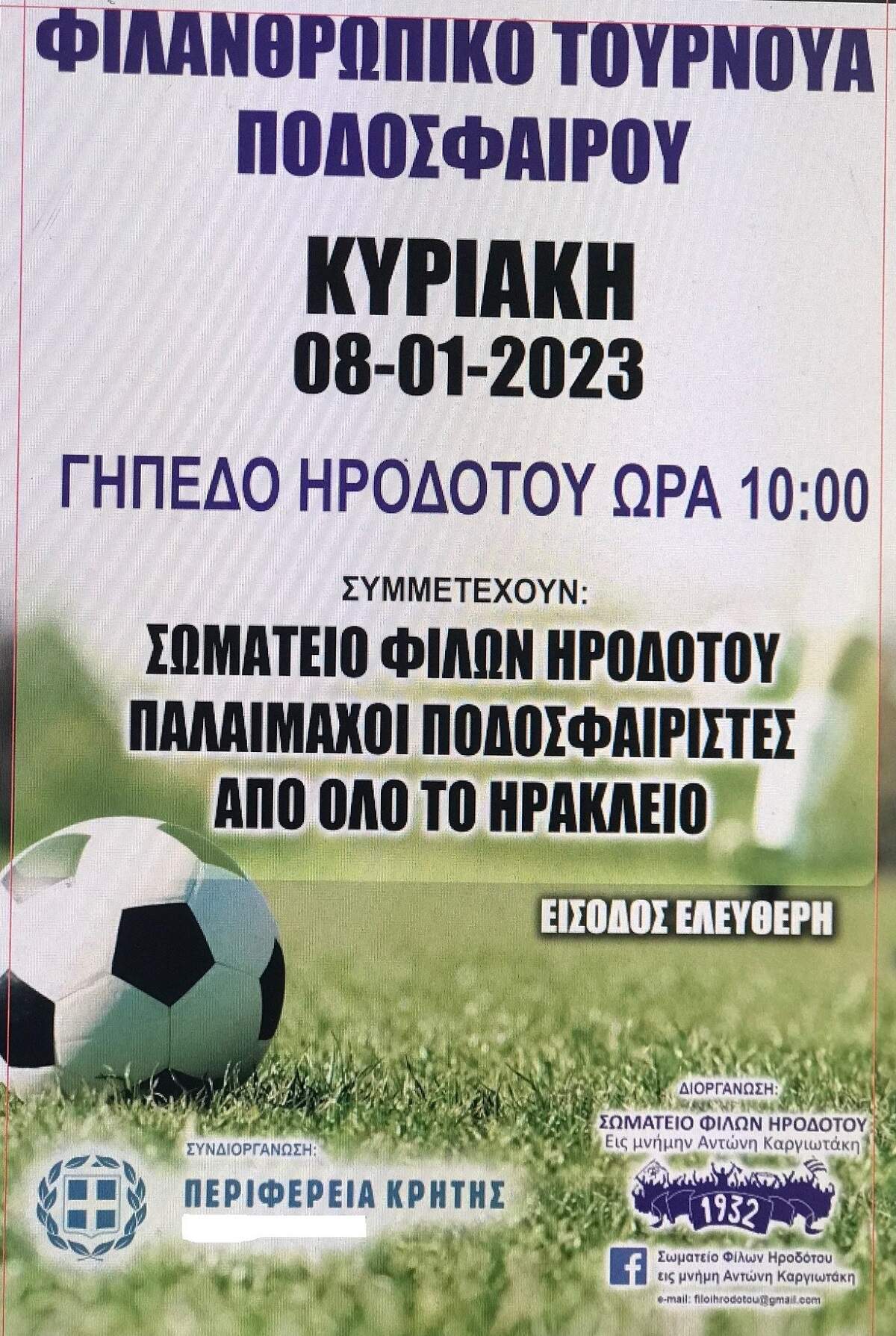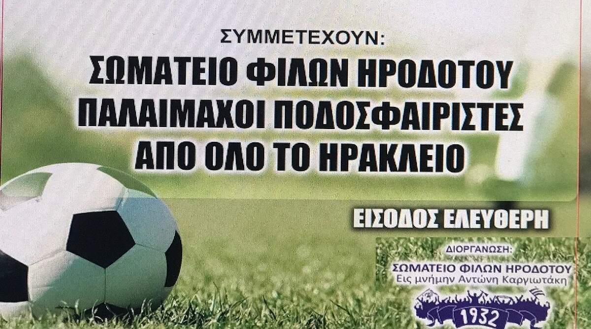 Το «Σωματείο Φίλων Ηροδότου» εις μνήμη Αντωνίου Καργιωτάκη, οργανώνει φιλανθρωπικό τουρνουά ποδοσφαίρου με την στήριξη της Περιφέρειας Κρήτης. Στόχος του τουρνουά, που θα πραγματοποιηθεί την Κυριακή 8 Ιανουαρίου στις 10 το πρωί στο δημοτικό στάδιο Νέας Αλικαρνασσού, να στηριχθούν άπορες οικογένειες. Θα πάρουν μέρος 4 ομάδες Βετεράνων Ποδοσφαιριστών του Ηρακλείου, και η είσοδος για τους φιλάθλους θα είναι ελεύθερη.