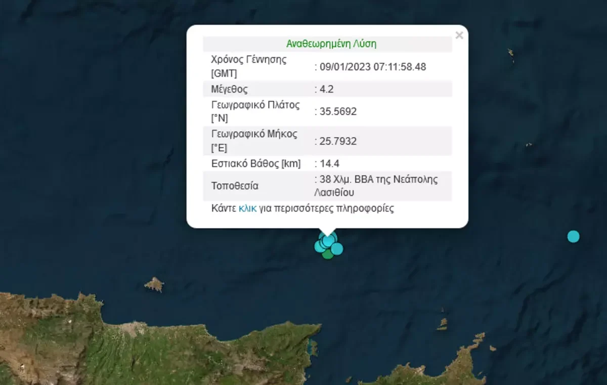 Σεισμός 4,2 Ρίχτερ, κατά το Γεωδυναμικό Ινστιτούτο ή 4,4 Ρίχτερ κατά το Ευρωμεσογειακό έγινε αισθητός στις 09.11 το πρωί της Δευτέρας στην Κρήτη και συγκεκριμένα σε υποθαλάσσιο χώρο βόρεια της Νεάπολης Λασιθίου.