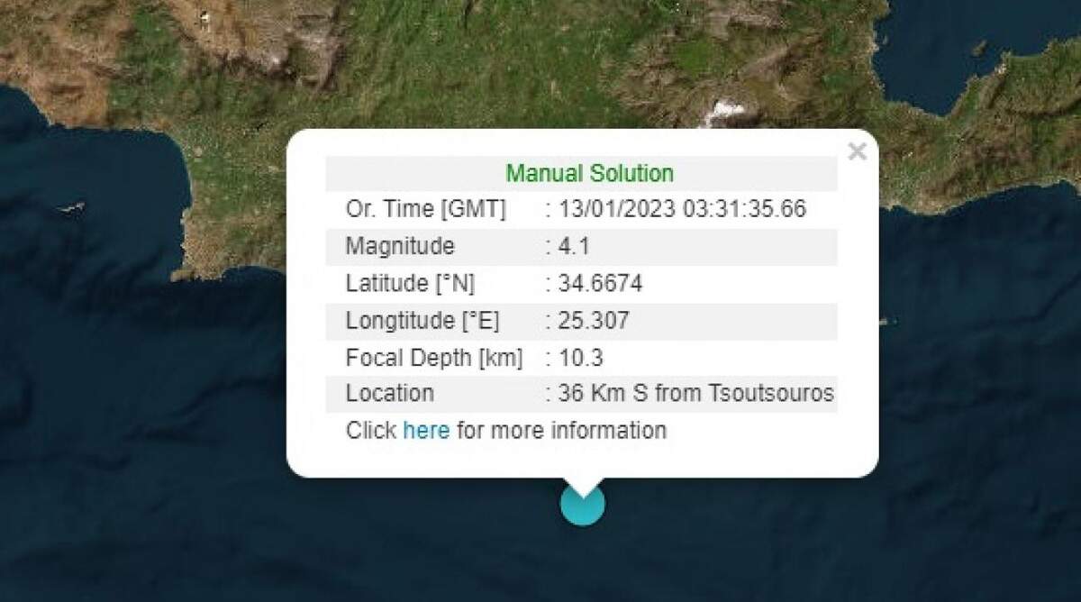 Το μέγεθος του σεισμού που καταγράφηκε στις 5.31 ήταν 4,1 Ρίχτερ. Το επίκεντρό του εντοπίζεται στον θαλάσσιο χώρο 36 χλμ νότια του Τσούτσουρα και το εστιακό του βάθος υπολογίζεται στα 10, 3 χλμ.