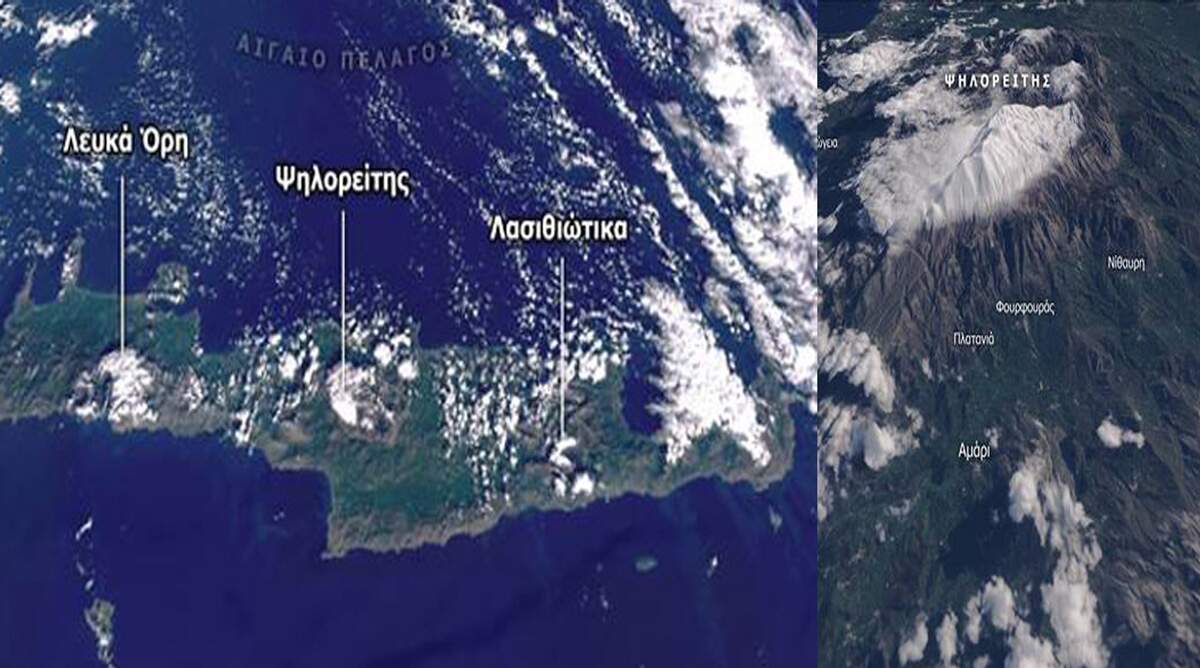Οι σχετικά ανέφελες συνθήκες στην Κρήτη το Σάββατο επέτρεψαν την δορυφορική αποτύπωση της χιονόπτωσης στα βουνά της.