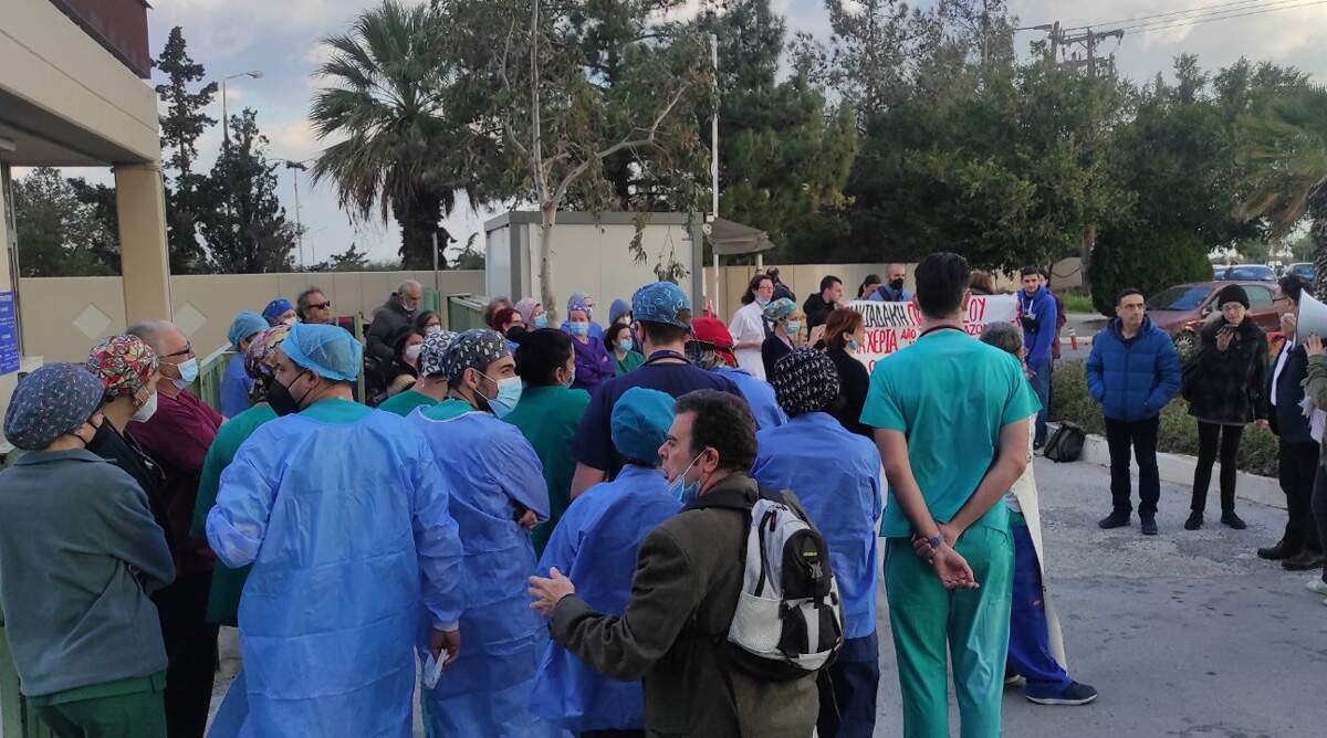 Οι εργαζόμενοι με συνθήματα και πανό διαμαρτύρονται για τις αυθαιρεσίες του διοικητή του νοσοκομείου, ο οποίος δεν δίστασε να στείλει γιατρό εργασίας στα σπίτια αναισθησιολόγων που νοσούσαν με covid, καθώς και για την απόφαση του υπουργείου υγείας να παρατείνει τη θητεία του, παρά τις διαμαρτυρίες των εργαζόμενων.