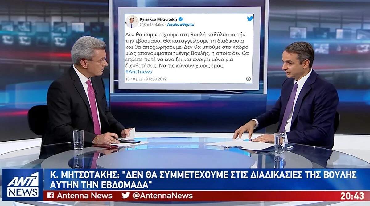 Το ημερολόγιο έγραφε 3 Ιουνίου 2019 και η προεκλογική περίοδος είχε πάρει φωτιά όταν ο Κυριάκος Μητσοτάκης, ως καλεσμένος στο κεντρικό δελτίο ειδήσεων του ΑΝΤ1 και στον Νίκο Χατζηνικολάου, είχε δηλώσει με αφορμή τα νομοσχέδια που θα έρχονταν προς ψήφιση το επόμενο διάστημα: «Δεν θα συμμετέχουμε στη Βουλή καθόλου αυτήν την εβδομάδα. Θα καταγγείλουμε τη διαδικασία και θα αποχωρήσουμε. Δεν θα μπούμε στο κάδρο μίας απονομιμοποιημένης Βουλής, η οποία δεν θα έπρεπε ποτέ να ανοίξει και ανοίγει μόνο για διευθετήσεις. Να τις κάνουν χωρίς εμάς», με τα στελέχη του κόμματός του να χειροκροτούν την επόμενη μέρα στα κανάλια που φιλοξενούνταν την απόφασή του