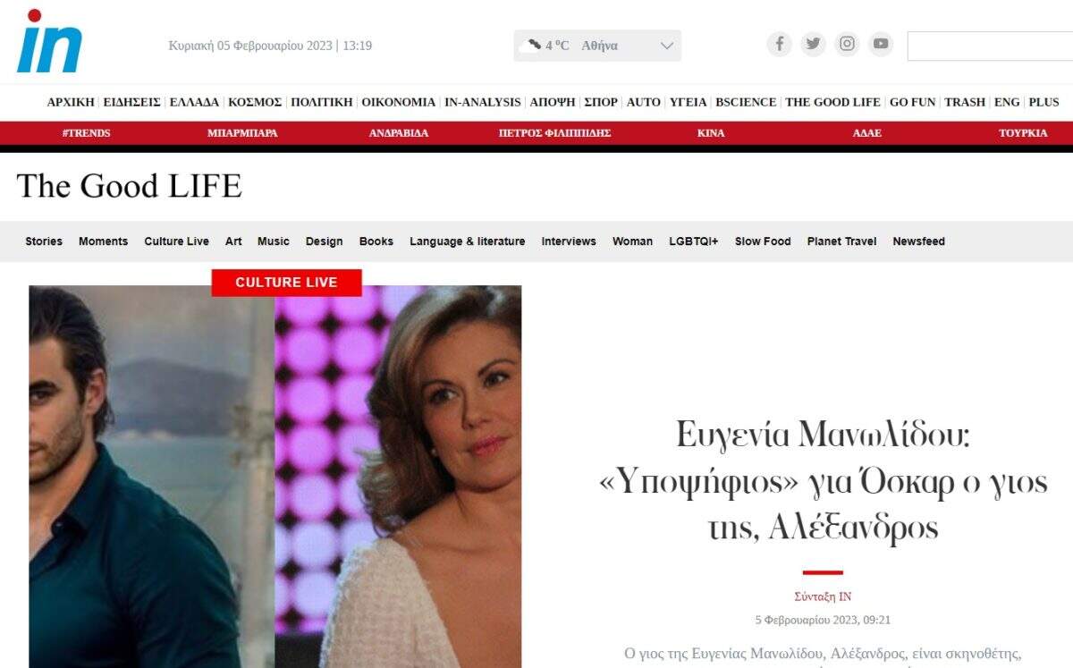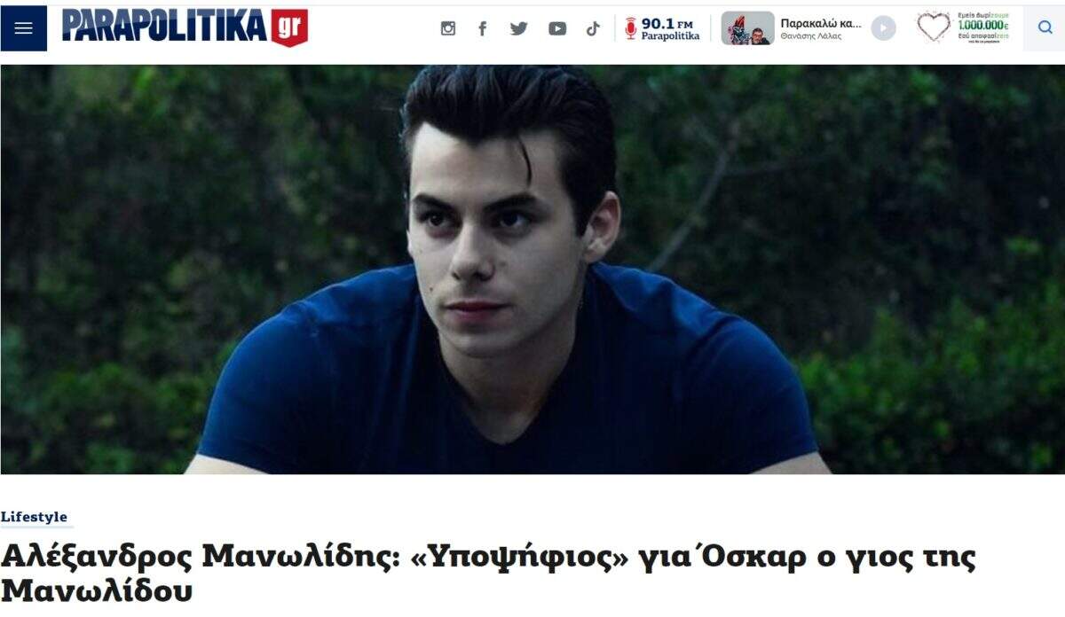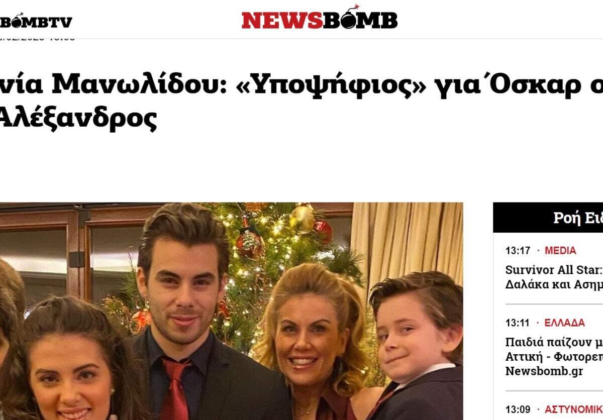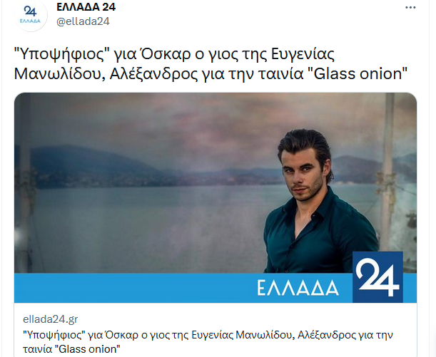 Μπαίνω να δω σε ποια κατηγορία είναι υποψήφιος και διαβάζω, καταρχάς, στον πρόλογο για τη «Μεγάλη διάκριση για τον 27χρονο Αλέξανδρο Μανωλίδη με το “Glass onion: A knives out mystery”». Αυτή είναι η ταινία. Και συνεχίζει το ρεπορτάζ: «Πιο υπερήφανη από ποτέ για τον αγαπημένο της γιο, Αλέξανδρο είναι η Ευγενία Μανωλίδου, μιας και βρίσκεται ένα βήμα πριν… το Όσκαρ. Και αυτό μιας και η νέα χρονιά ξεκινά με μια σημαντική υποψηφιότητα για τον νεαρό καλλιτέχνη, ο οποίος συμμετείχε στην ταινία “Glass onion: A knives out mystery” που προτάθηκε για το καλύτερο διασκευασμένο σενάριο».