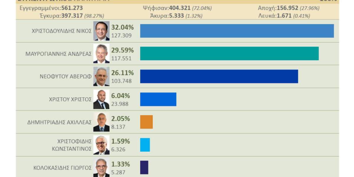 Νίκος Χριστοδουλίδης και Ανδρέας Μαυρογιάννης περνούν στον δεύτερο γύρο των προεδρικών εκλογών της Κύπρου που αναμένεται να διεξαχθεί στις 12 Φεβρουαρίου. Αξίζει να σημειωθεί ότι οι 3,5 μήνες πριν, οι δημοσκοπήσεις έφερναν τον Ανδρέα Μαυρογιάννη ο οποίος υποστηρίζεται από το ΑΚΕΛ και πέρασε στον δεύτερο γύρο, τρίτο με 13,5 μονάδες διαφορά από τον Νίκο Χριστοδουλίδη. Υπενθυμίζεται ότι ο Νίκος Χριστοδουλίδης συγκέντρωσε 32% ενώ ο Ανδρέας Μαυρογιάννης 29,6%.
