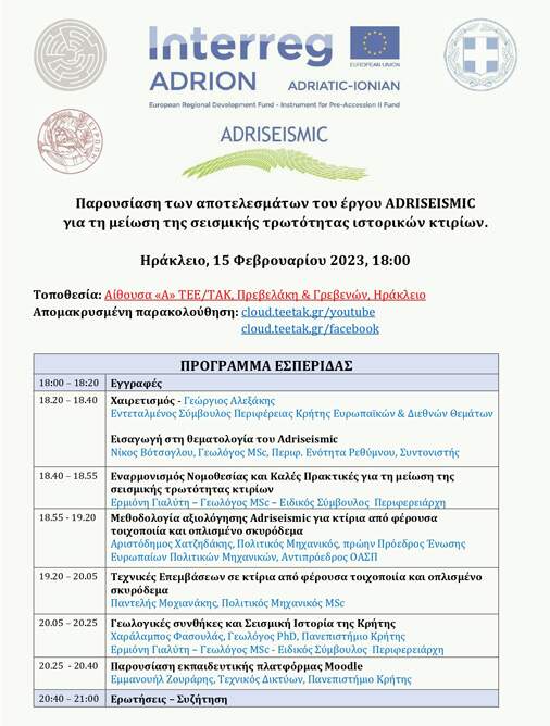 Αναβάλλεται η παρουσίαση του προγράμματος INTERREG – ADRISEISMIC με θέμα τη «Μείωση της σεισμικής τρωτότητας των διατηρητέων κτιρίων στα ιστορικά κέντρα των πόλεων». Νέα ημερομηνία Τετάρτη 15/2/2023 και ώρα 18.00 στο κτίριο ΤΕΕ/ΤΑΚ.